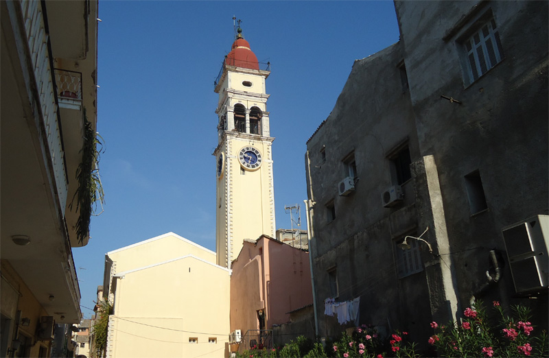Το πανύψηλο καμπαναριό που φαίνεται, όπου και αν κινείστε, ανήκει στον Αγ. Σπυρίδωνα τον πολιούχο της Κέρκυρας. Ο ναός χτίστηκε το 1590 και εντός του φυλάσσεται το ιερό σκήνωμα του αγίου.